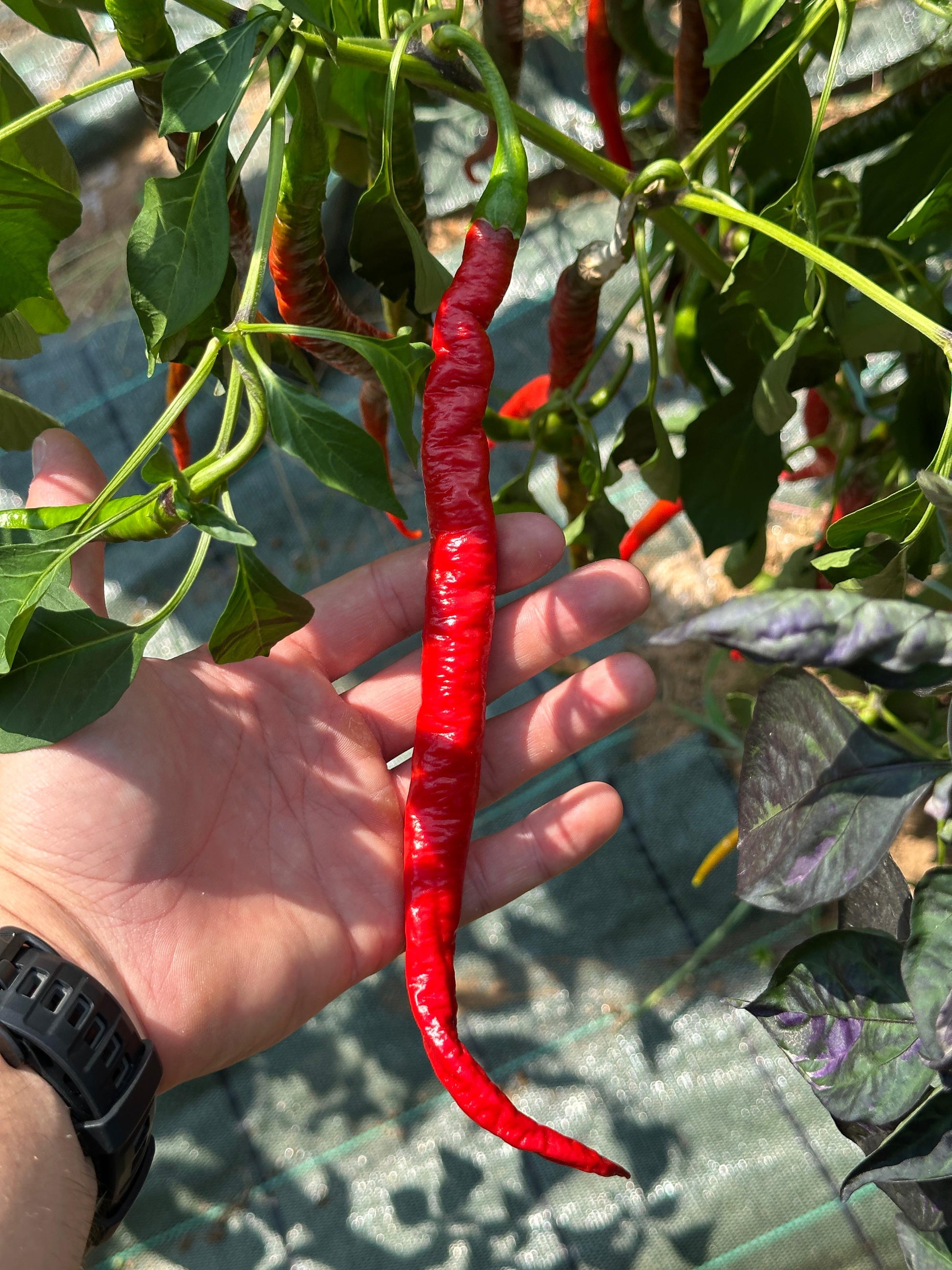 Il Joe’s Long Cayenne è una varietà ereditata dell'Italia meridionale, apprezzata per la sua lunghezza e produttività. I frutti sottili e lunghi fino a 30 cm maturano da verde a rosso intenso, offrendo una piccantezza media con un retrogusto leggermente dolce. La pianta è robusta e adatta alla coltivazione in vaso o in giardino.